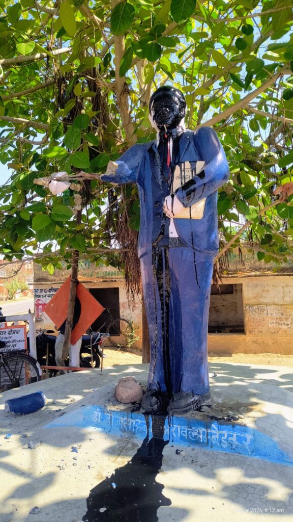 Anger erupted over the desecration of Baba Saheb’s statue: सतना जिले के उचेहरा थाना क्षेत्र अंतर्गत गोबरांव कलां गांव में शुक्रवार सुबह उस वक्त भारी तनाव की स्थिति निर्मित हो गई, जब असामाजिक तत्वों द्वारा संविधान निर्माता डॉ. भीमराव अंबेडकर की प्रतिमा को खंडित कर उस पर कालिख पोत दी गई। इस घटना की खबर फैलते ही सैकड़ों की संख्या में ग्रामीण सड़क पर उतर आए और उचेहरा-नागौद मार्ग को पूरी तरह बाधित कर दिया। लगभग डेढ़ घंटे तक चले इस चक्काजाम के बाद प्रशासन ने सूझबूझ दिखाते हुए नई प्रतिमा स्थापित करने का आश्वासन दिया, तब जाकर मामला शांत हुआ।