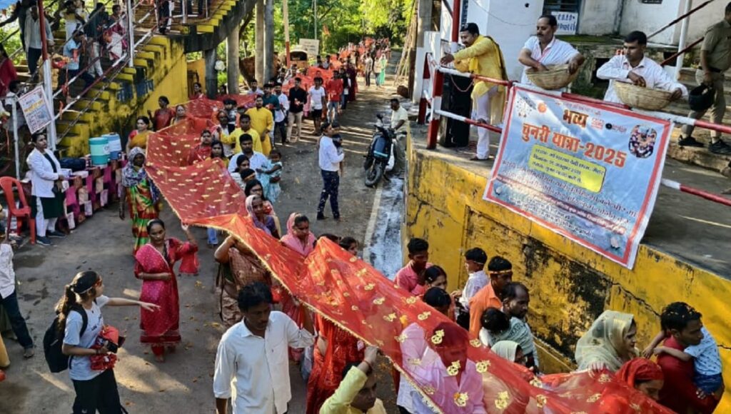 मैहर। मैहर जिले के गौरव दिवस के अवसर पर जगत जननी मां शारदा को समर्पित विशाल चूनर यात्रा निकाली गई। 3500 मीटर लंबी यह चूनर यात्रा तकरीबन 5 किमी का सफर तय करके माता शारदा के दरवार में पहुची। जंहा माता रानी को नगर वासियों ने यह चूनर समर्पित किया। माँ शारदा धाम में निकाली गई इस ऐतिहासिक चुनर यात्रा को एशिया में अब तक की सबसे विशाल चुनर यात्रा बताई जा रही है, इस भव्य चूनर यात्रा को एशिया बुक ऑफ रिकॉर्ड्स की टीम ने अद्भुद माना है और यह चूनर यात्रा अब एशिया बुक ऑफ रिकॉर्ड्स में दर्ज हो गई है। मैहर के लिए यह एक बड़ी उपलब्धी के रूम में मानी जा रही है।