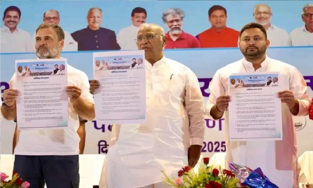 INDIA Bihar Election Manifesto: बिहार विधानसभा चुनाव (Bihar Assembly Elections) की रणभेरी बजने से पहले INDIA गठबंधन (INDIA Alliance) ने सामाजिक न्याय का नया खेल शुरू कर दिया। महागठबंधन ने ‘अतिपिछड़ा न्याय संकल्प पत्र’ लॉन्च किया, जिसमें अतिपिछड़ों EBC, SC, ST और OBC के लिए जमीन, आरक्षण और सुरक्षा के 10 बड़े वादे हैं। कांग्रेस अध्यक्ष मल्लिकार्जुन खड़गे (Mallikarjun Kharge), सांसद राहुल गांधी (Rahul Gandhi) और RJD नेता तेजस्वी यादव (Tejashwi Yadav) ने पटना में इस संकल्प पत्र को रिलीज किया। गठबंधन का दावा है कि ये कदम बिहार के सबसे हाशिए पर पड़े वर्गों को सशक्त करेगा सवाल ये है कि क्या ये BJP को चुनौती दे पाएगा?