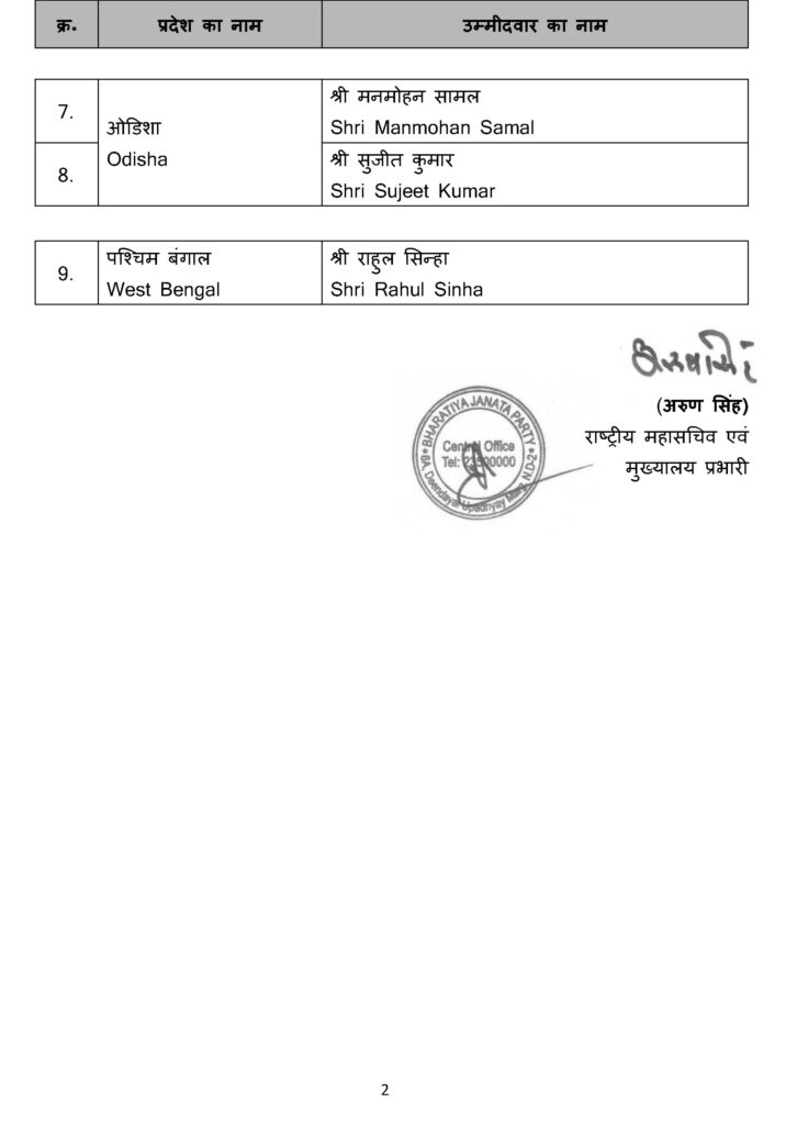हरियाणा की राजनीति में पंजाबी समुदाय के बड़े नेता और पूर्व सांसद संजय भाटिया (सामान्य) को राज्यसभा भेजकर पार्टी ने गैर-जाट वोट बैंक को मजबूत किया है। वहीं, पश्चिम बंगाल से पार्टी के अनुभवी नेता राहुल सिन्हा को मौका मिला है, जो कायस्थ (सामान्य) समाज का प्रतिनिधित्व करते हैं और पहले प्रदेश अध्यक्ष भी रह चुके हैं। ओडिशा में भी अनुभवी नेता और पूर्व प्रदेश अध्यक्ष मनमोहन सामल को उम्मीदवार बनाया गया है, जो ब्राह्मण (सामान्य) समाज से आते हैं।