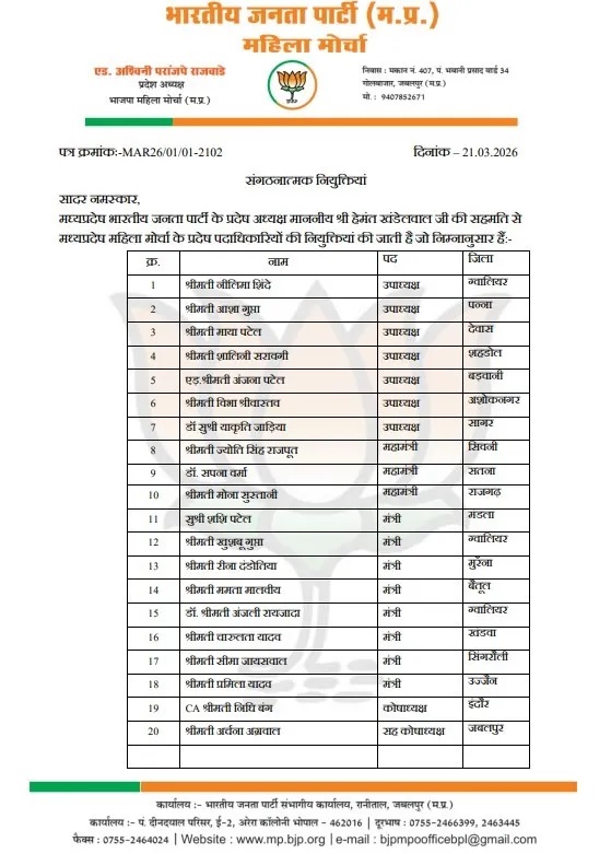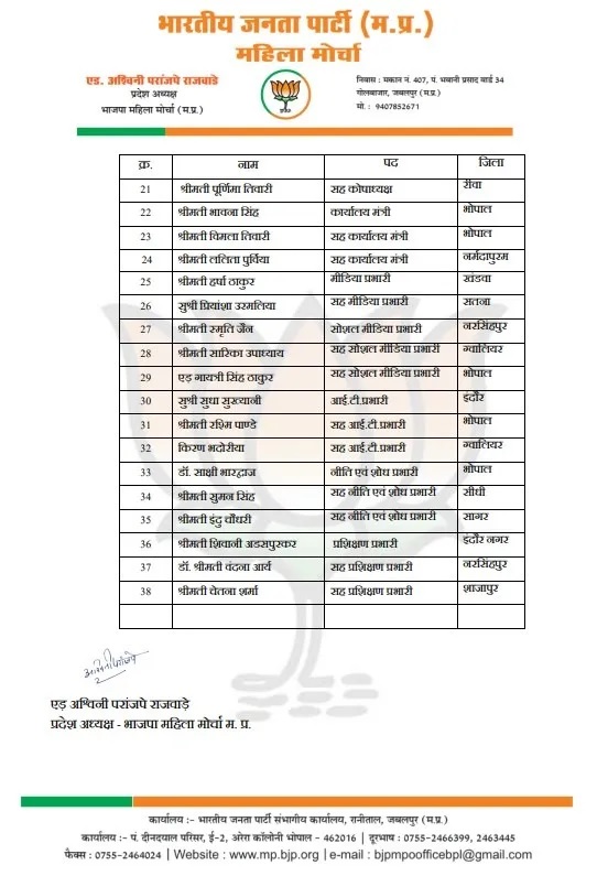 जिन 38 पदाधिकारियों की नियुक्त में महिला मोर्चा में की गई है। उनमें 7 प्रदेश उपाध्यक्ष, 3 प्रदेश महामंत्री, 8 प्रदेश मंत्री, कोषाध्यक्ष, सह कोषाध्यक्ष, कार्यालय मंत्री व सह कार्यालय मंत्री, मीडिया प्रभारी, सह मीडिया प्रभारी, इंटरनेट मीडिया, आइटी, नीति एवं शोध और प्रशिक्षण प्रभारी व सह प्रभारी भी बनाए गए हैं।