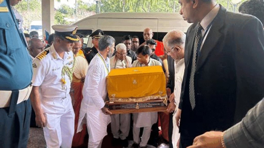 The Holy Relics departed from the Bandaranaike International Airport (BIA) in Colombo amidst traditional honors and high-level state representation. A high-level Indian delegation, led by Madhya Pradesh Governor Mangubhai C. Patel and Arunachal Pradesh Deputy Chief Minister Chowna Mein, escorted the sacred remains back to Indian soil.