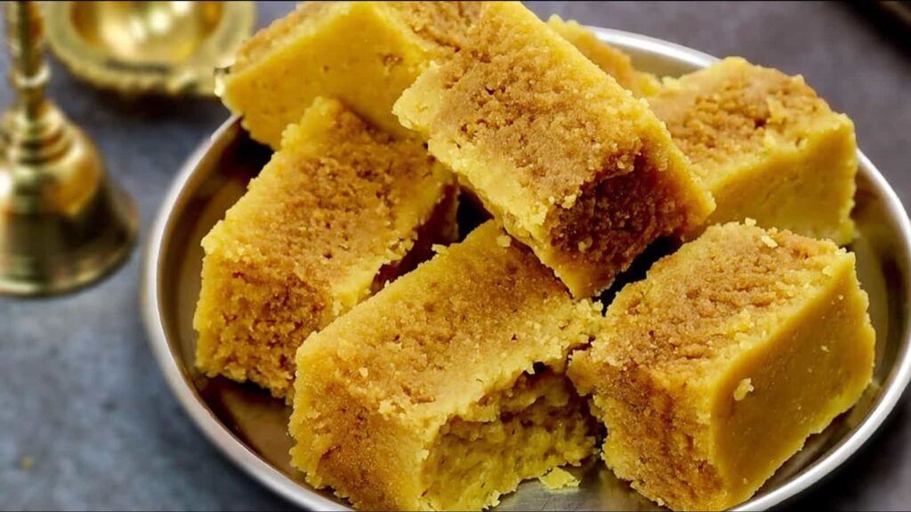 सेट करें – घी लगी थाली में डालें, ऊपर से चिकना करें और हल्का ठंडा होने पर चाकू से मनचाहे आकार में काट लें।