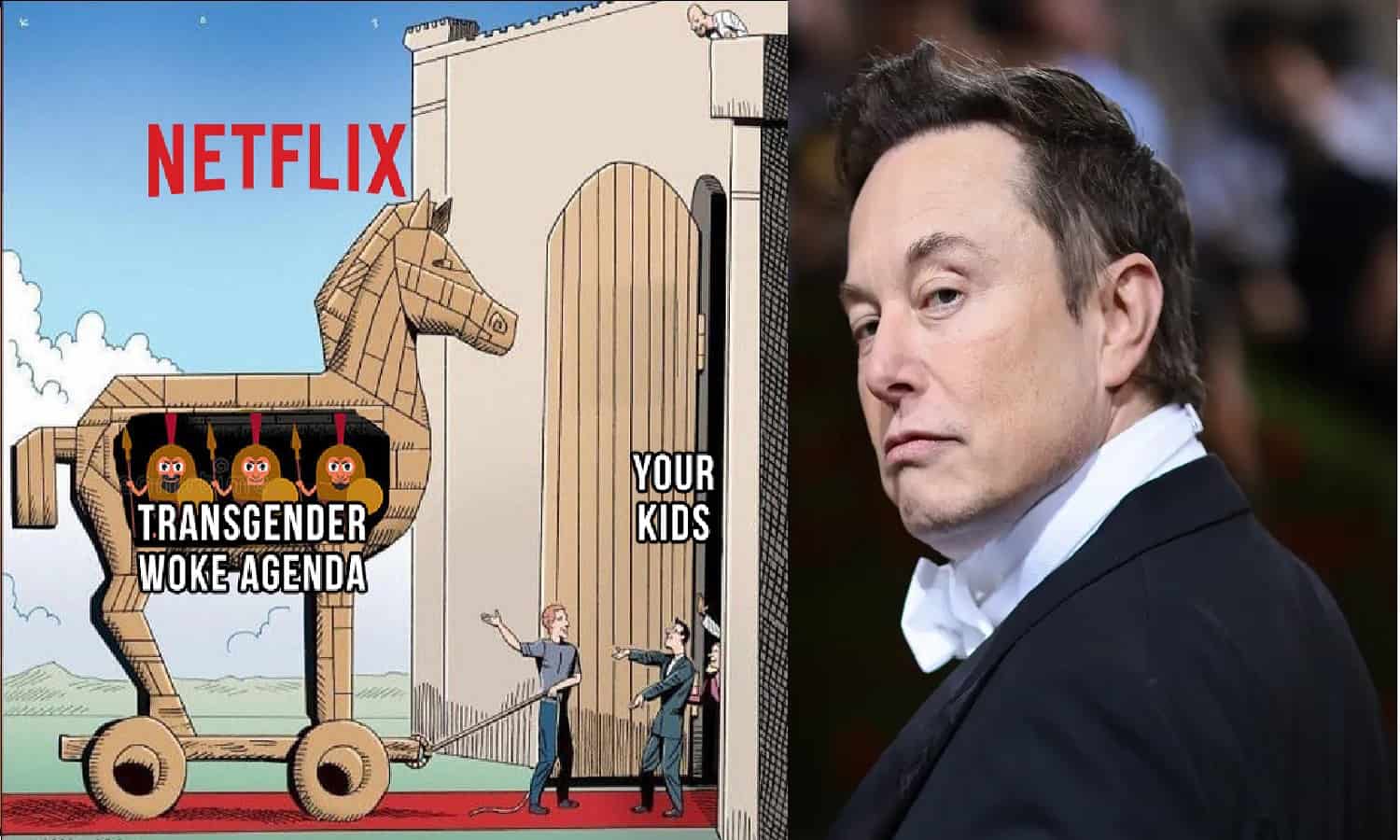 मस्क ने इसे बच्चों के लिए अनसुटेबल कंटेंट बताते हुए नेटफ्लिक्स से सब्सक्रिप्शन कैंसिल करने की बात कही। इसके अलावा, मस्क ने नेटफ्लिक्स को ट्रांसजेंडर एजेंडा (NETFLIX Transgender Agenda) और प्रोग्रामिंग को बढ़ावा देने का आरोप लगाया, जो उनकी मान्यताओं से मेल नहीं खाता। मस्क ने X पर यूजर्स को टैग करते हुए लिखा कि अगर नेटफ्लिक्स ऐसे कंटेंट को सपोर्ट करता है, तो उनके पैसे की जरूरत नहीं। यह पोस्ट डोग डिजाइनर की एक मीम के जवाब में आई, जिसमें नेटफ्लिक्स को ट्रॉजन हॉर्स (Trojan Horse Meme) की तरह बच्चों के लिए खतरा बताया गया था