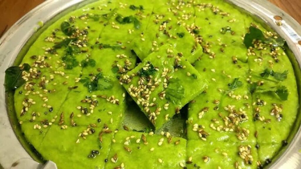 सबसे पहले पालक और मटर के दानों को धोकर 1-2 मिनट उबलते पानी में ब्लांच करें और ठंडे पानी में डालकर हरा रंग सुरक्षित रखें। फिर इसकी स्मूद प्यूरी बना लें। एक बड़े बाउल में बेसन, दही, पालक प्यूरी, नमक, चीनी, अदरक-हरी मिर्च पेस्ट और हल्दी डालकर अच्छी तरह मिलाएं। बैटर को 10 मिनट के लिए ढककर रख दें ताकि बेसन अच्छे से सेट हो जाए। अब स्टीमर गरम करें। बैटर में ईनो डालकर हल्के हाथ से मिलाएं और तुरंत ग्रीस की हुई थाली में डाल दें। मध्यम आंच पर 12–15 मिनट तक स्टीम करें। टूथपिक डालकर चेक करें। ठंडा होने पर ढोकला मनचाहे आकार में काट लें। तड़के के लिए कढ़ाही में तेल गरम करें, राई चटकाएं, फिर करी पत्ता, हरी मिर्च और तिल डालें। यह तड़का ढोकला पर डालें और गरमागरम परोसें।