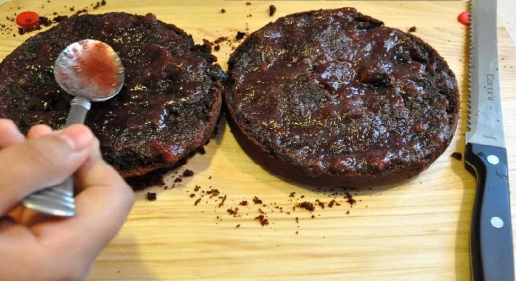 - बेक होने पर ठंडा होने दें और फिर केक को दो या तीन परतों में काट लें।