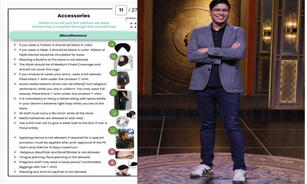 Lenskart Grooming Policy Controversy: TCS नासिक (TSC Nasik) में हुए लव जिहाद और कन्वर्जन कांड का खुलासा होने के बाद अब शार्क टैंक फेम पियूष बंसल (Peyush Bansal) की कंपनी लेंसकार्ट पब्लिक के निशाने में है. सोशल मीडिया में लेंसकार्ट ग्रूमिंग पॉलिसी की गाइडबुक (Lenskart Grooming Policy Book) वायरल है जिसे पढ़कर यकीन ही नहीं होता है कि ये कंपनी भारत में चल रही है या पाकिस्तान में.