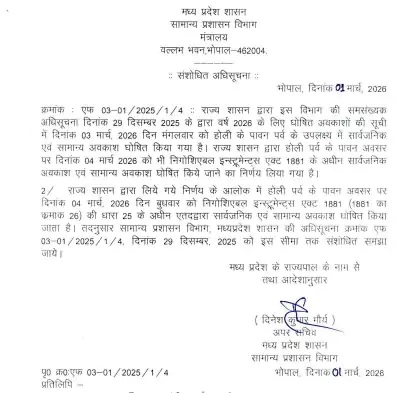 एमपी। मध्य प्रदेश के सरकारी कर्मचारियों और नागरिकों के लिए होली के त्योहार पर एक अच्छी खबर है। राज्य शासन ने होली के उपलक्ष्य में छुट्टियों की सूची में संशोधन करते हुए अब 4 मार्च को भी सार्वजनिक अवकाश घोषित कर दिया है, यानि कि अब दो दिन का अवकाश रहेगा, दरअसल राज्य सरकार ने पहले ही 3 मार्च को होली के लिए सार्वजनिक अवकाश घोषित किया था। लेकिन अब रविवार को जारी नए आदेश के अनुसार, अब 3 और 4 मार्च 2026 दोनों दिन सार्वजनिक और सामान्य अवकाश रहेगा।