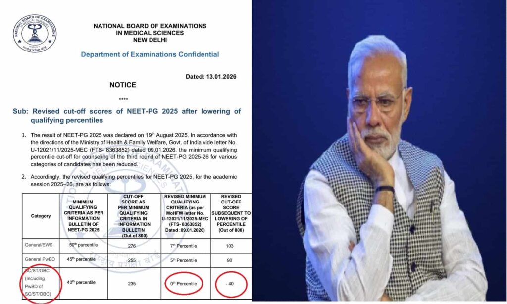 NEET PG Cut Off Controversy/ NEET PG -40 Percentile: नीट पीजी (NEET PG) 2025 के काउंसलिंग में सरकार ने कटऑफ (NEET PG Cut Off For ST SC OBC) को शून्य प्रतिशत तक गिरा दिया है। अब सामान्य वर्ग के उम्मीदवारों के लिए कटऑफ पांचवें प्रतिशत (5th percentile) से घटाकर शून्य प्रतिशत कर दिया गया है। इसका मतलब है कि नेगेटिव मार्क्स के साथ भी उम्मीदवार अब एमडी/एमएस सीटों के लिए काउंसलिंग में शामिल हो सकते हैं। इस फैसले की देशभर में जमकर आलोचना हो रही है और सोशल मीडिया पर #NEETScam और #ZeroPercentDoctor जैसे ट्रेंड चल रहे हैं।