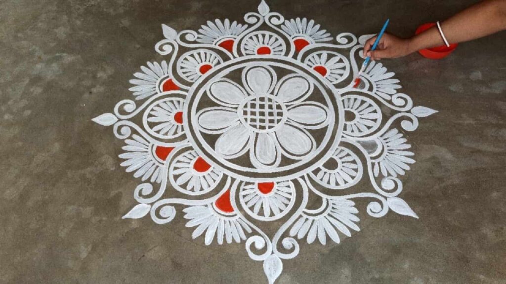 घर में सुख-समृद्धि – गेरू -चावल से बनी यह अल्पना घर में सकारात्मक ऊर्जा और लक्ष्मी कृपा लाती है। इसे बनाने से वातावरण शुद्ध और पवित्र बनता है।