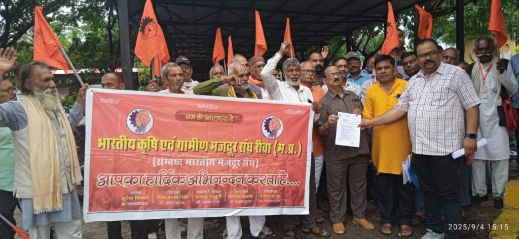 रीवा, 4 सितंबर। किसानों की समस्याओं को लेकर भारतीय मजदूर संघ से संबद्ध भारतीय कृषि एवं ग्रामीण मजदूर संघ ने मंगलवार को जिला मुख्यालय पर धरना-प्रदर्शन किया और अपनी मांगों के समर्थन में जिला कलेक्टर को ज्ञापन सौपा।