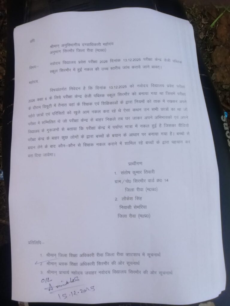 Allegation of fixing in Jawahar Navodaya Vidyalaya entrance exam: रीवा जिले के सिरमौर क्षेत्र में जवाहर नवोदय विद्यालय (JNV) की कक्षा 6 प्रवेश परीक्षा-2026 में अनियमितता और फिक्सिंग के गंभीर आरोप लगे हैं। अभिभावकों ने इस मामले में एसडीएम को लिखित शिकायत दी है। साथ ही सोशल मीडिया पर एक वीडियो वायरल हो रहा है, जिसमें परीक्षा के दौरान कुछ चुनिंदा बच्चों को नकल कराकर पास कराने की बात कही जा रही है। इससे परीक्षा प्रक्रिया की निष्पक्षता पर बड़ा सवाल खड़ा हो गया है।जिले की कलेक्टर प्रतिभा पाल ने कहा कि मामला उनके संज्ञान में है। जांच के बाद ही उचित कार्रवाई की जाएगी।
