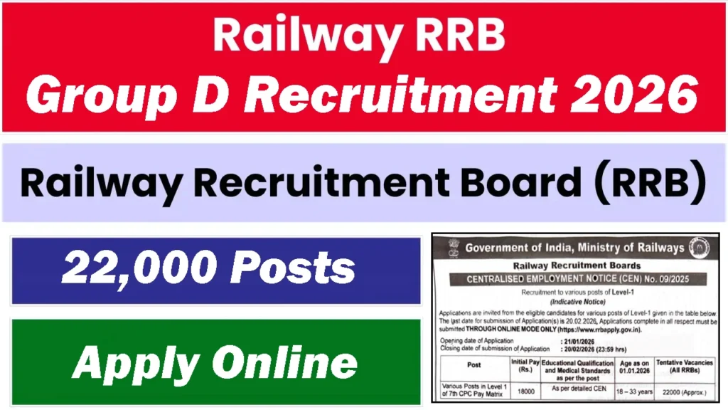 भारतीय रेलवे में सरकारी नौकरी का सपना देख रहे युवाओं के लिए बड़ी खबर है। रेलवे भर्ती बोर्ड (RRB) ने RRB Group D Recruitment 2026 के तहत लेवल-1 के 22,195 पदों पर भर्ती प्रक्रिया आज, 31 जनवरी से शुरू कर दी है। इच्छुक उम्मीदवार आधिकारिक वेबसाइट rrbapply.gov.in पर जाकर अपना पंजीकरण करा सकते हैं।