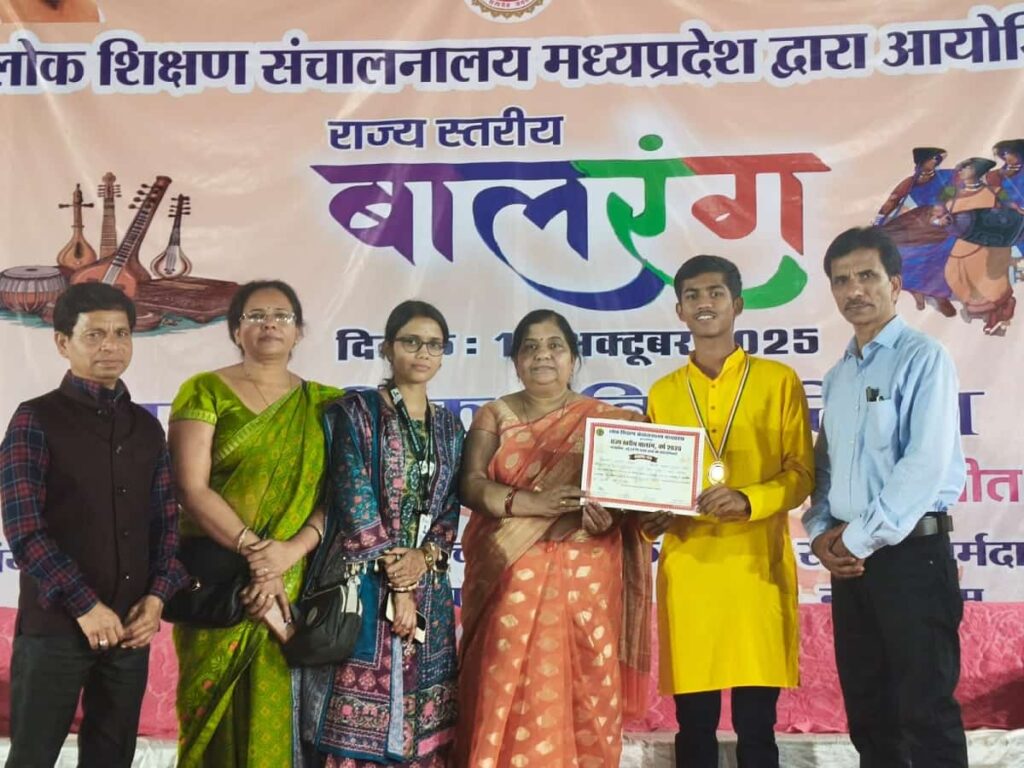 Stete-Level Chiltural Competition :’सुगम गायन’ में सृजन को तीसरी बार प्रथम स्थान-लोक शिक्षण संचालनालय मध्यप्रदेश द्वारा 13 अक्टूबर 2025 को नर्मदापुरम में राज्य स्तरीय बालरंग,सांस्कृतिक प्रतियोगिता आयोजित की गई जिसके अंतर्गत “सुगम गायन” विधा में सीधी के सृजन मिश्र ने प्रथम स्थान प्राप्त कर जिला और संभाग का नाम रोशन किया है। सृजन न केवल संगीत बल्कि अभिनय के क्षेत्र में भी बढ़ चढ़कर हिस्सा लेते हैं,इन्द्रवती नाट्य समिति ‘सीधी रंगमंच’ में रहकर रोशनी प्रसाद मिश्र एवं नीरज कुंदेर द्वारा निर्देशित नाटकों में संगीत संयोजन के साथ-साथ अभिनय में भी अपनी शानदार उपस्थिति से रंगमंच में अहम भूमिका निभा रहे हैं। तथा श्लोक भी नाट्य समिति के नाटकों में संगत करते रहे हैं।उनकी इस उपलब्धि पर संयुक्त संचालक रीवा द्वारा सम्मानित किया गया।