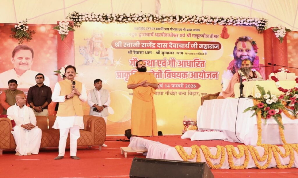 रीवा। बसामन मामा गौवंश वन्य विहार में श्री रेवासा धाम, श्री वृंदावन धाम के पावन सानिध्य में मलूक पीठाधीश्वर राजेंद्रदास महाराज द्वारा गौ कथा एवं गौ आधारित प्राकृतिक खेती विषय पर दिव्य कथा का आयोजन किया जा रहा है। उपमुख्यमंत्री राजेन्द्र शुक्ल ने कहा कि पूज्य महाराज का रीवा आगमन हम सबके लिए सपना साकार होने जैसा है। उन्होंने कहा कि जब देश में बड़े धार्मिक आयोजन होते हैं तो संतों को सर्वाेच्च स्थान दिया जाता है, ऐसे महान संत का हमारे बीच उपस्थित होना पूरे क्षेत्र का सौभाग्य है। इस आयोजन से क्षेत्र में अपार उत्साह और उमंग का वातावरण है। महाराज जी की अमृतवाणी से बहने वाली कथा की रसधारा गौसंरक्षण, गौ आधारित प्राकृतिक खेती एवं सनातन मूल्यों को मार्गदर्शन देगी।